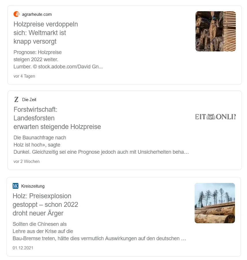 agrarheute berichtet von einer „Verdopplung der Holzpreise in Nordamerika“ zwischen November 2021 und Januar 2022 und stellt zudem fest: „Die Kosten für den Transport von Holz sind im Jahr 2021 nicht nur aufgrund steigender Kraftstoffkosten, sondern auch aufgrund des extremen Mangels an Lkw-Fahrern teurer geworden. Wie andere Branchen, die mit Arbeitsproblemen konfrontiert sind, hat die Speditionsbranche Schwierigkeiten, qualifizierte Fahrer zu finden und musste die gezahlten Löhne erhöhen. All diese Belastungen spiegeln sich in den Spitzenpreisen für Schnittholz wider.“ (Quelle: Agrarheute)